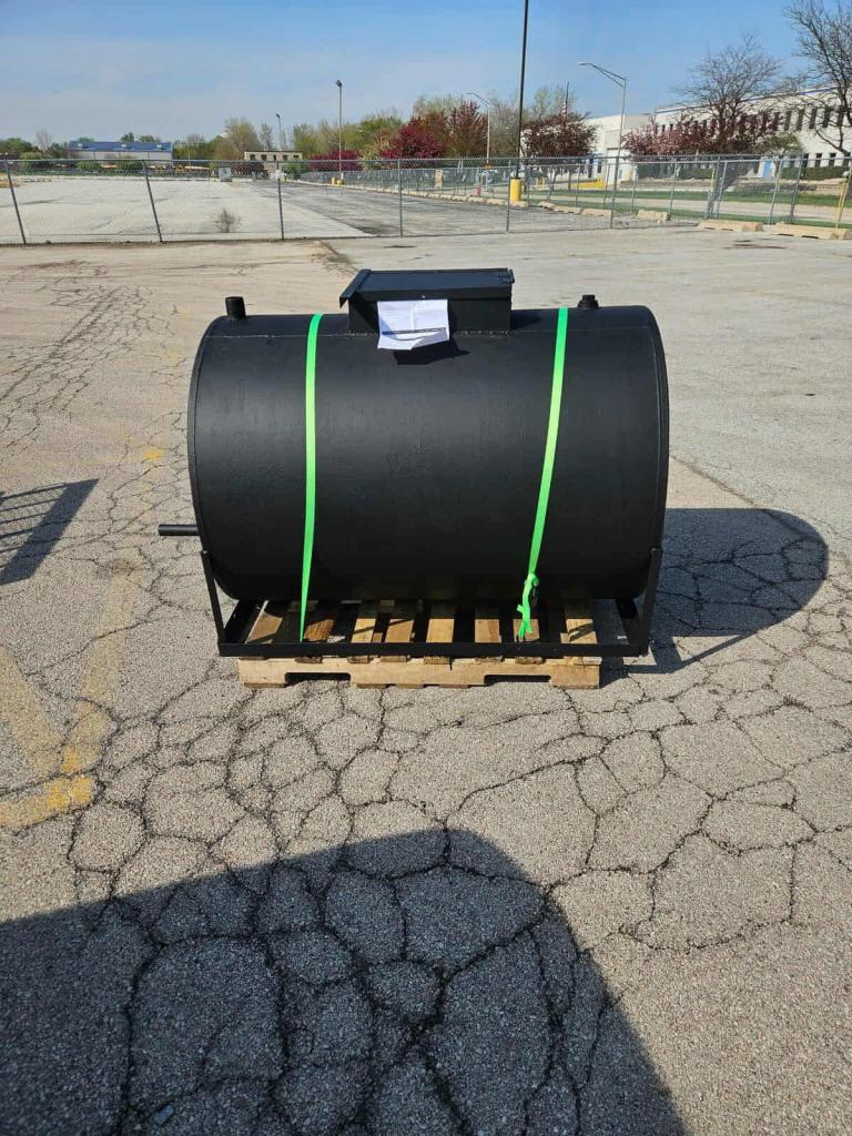 New 153 gallon sealcoating tank, it's never had sealer in the tank. All our sealcoating tanks have full sweep agitation to mix the sealer. Every tank has a 2" threaded pipe for your valve and a 2" returns on top of tank. We use inch and a half size pipe for the shaft in most tanks 1000 gallon and smaller. All tanks are primed then painted black. If you want green, yellow or orange its a upgrade. Just let me know and we will paint it whatever color you desire. The left over paint from the 1 gallon of paint will be included so you have the same color to touch it up if needed.